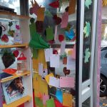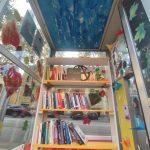La bibliocabina presente nel Piazzale San Savino è stata dipinta usando gli stessi colori di panchina e scultura adiacenti ed è stata pensata anche per lasciare dei disegni.