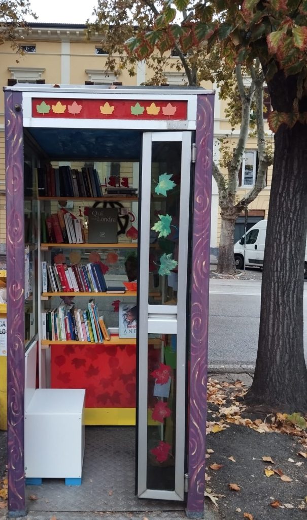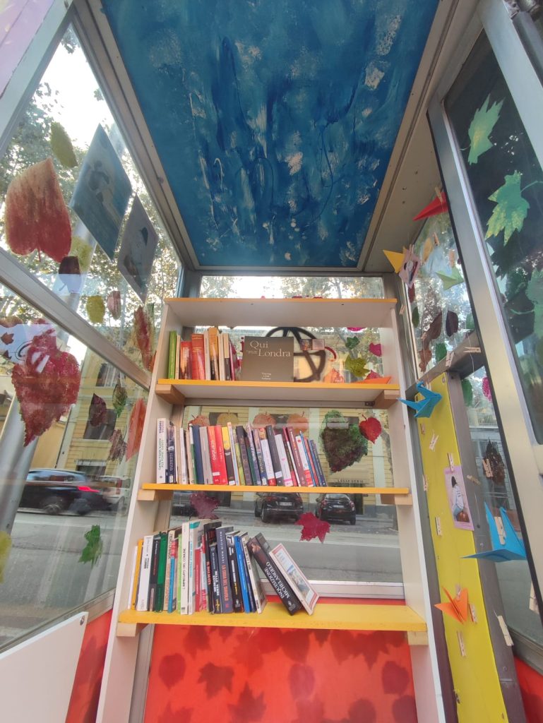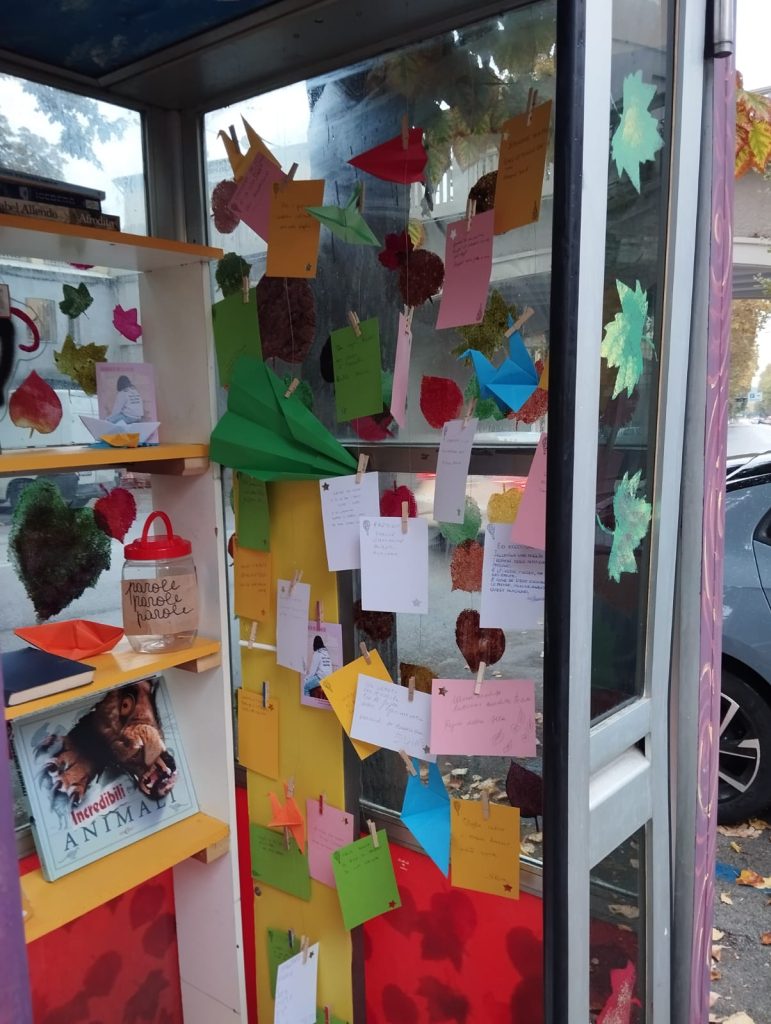La bibliocabina presente al Viale della Vittoria è stata dipinta in sintonia con l’ambiente circostante, ovvero con foglie di tutti colori ed è stata pensata per lasciare dei piccoli componimenti in prosa o in versi.